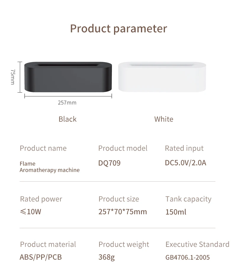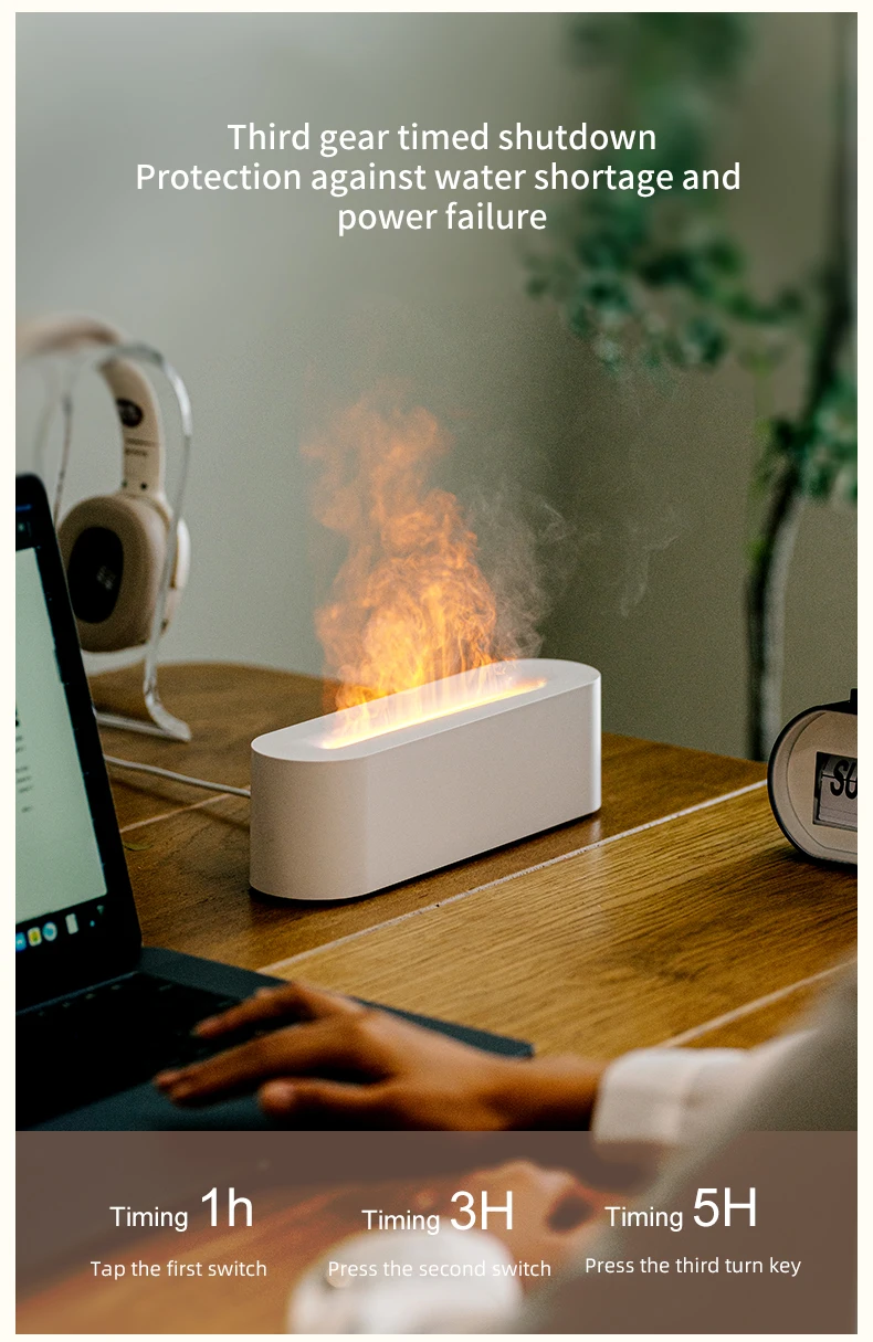 Flammes colorées simulées ; Atomisation délicate des huiles essentielles pour l’aromathérapie ; Arrêt temporisé à 3 vitesses ; Apparence simple, options bicolores classiques noir et blanc ; Protection anti-arrêt sans eau.